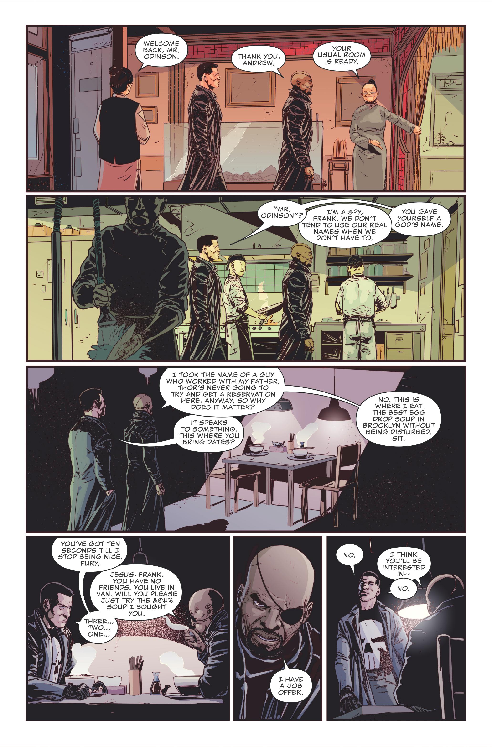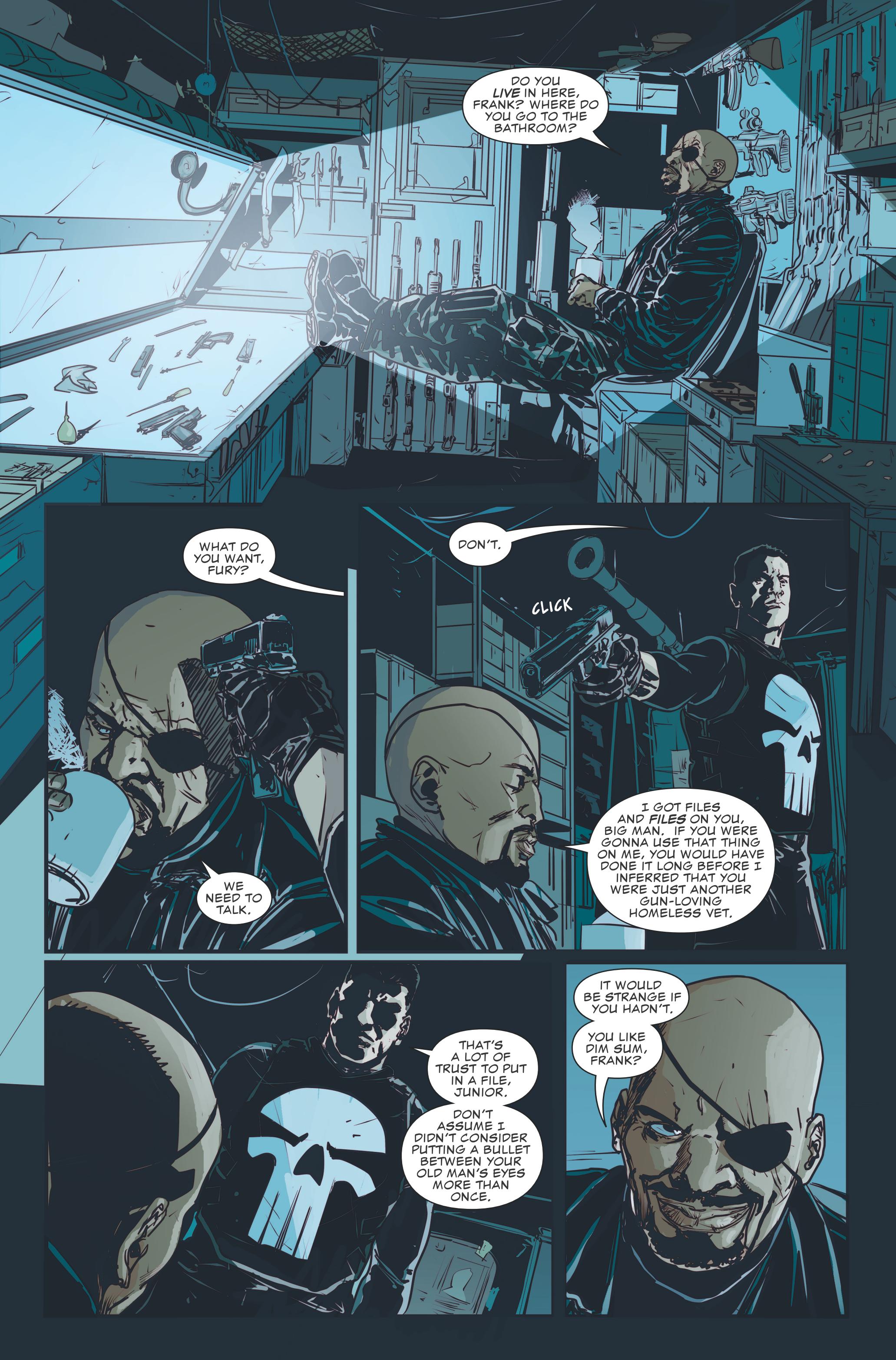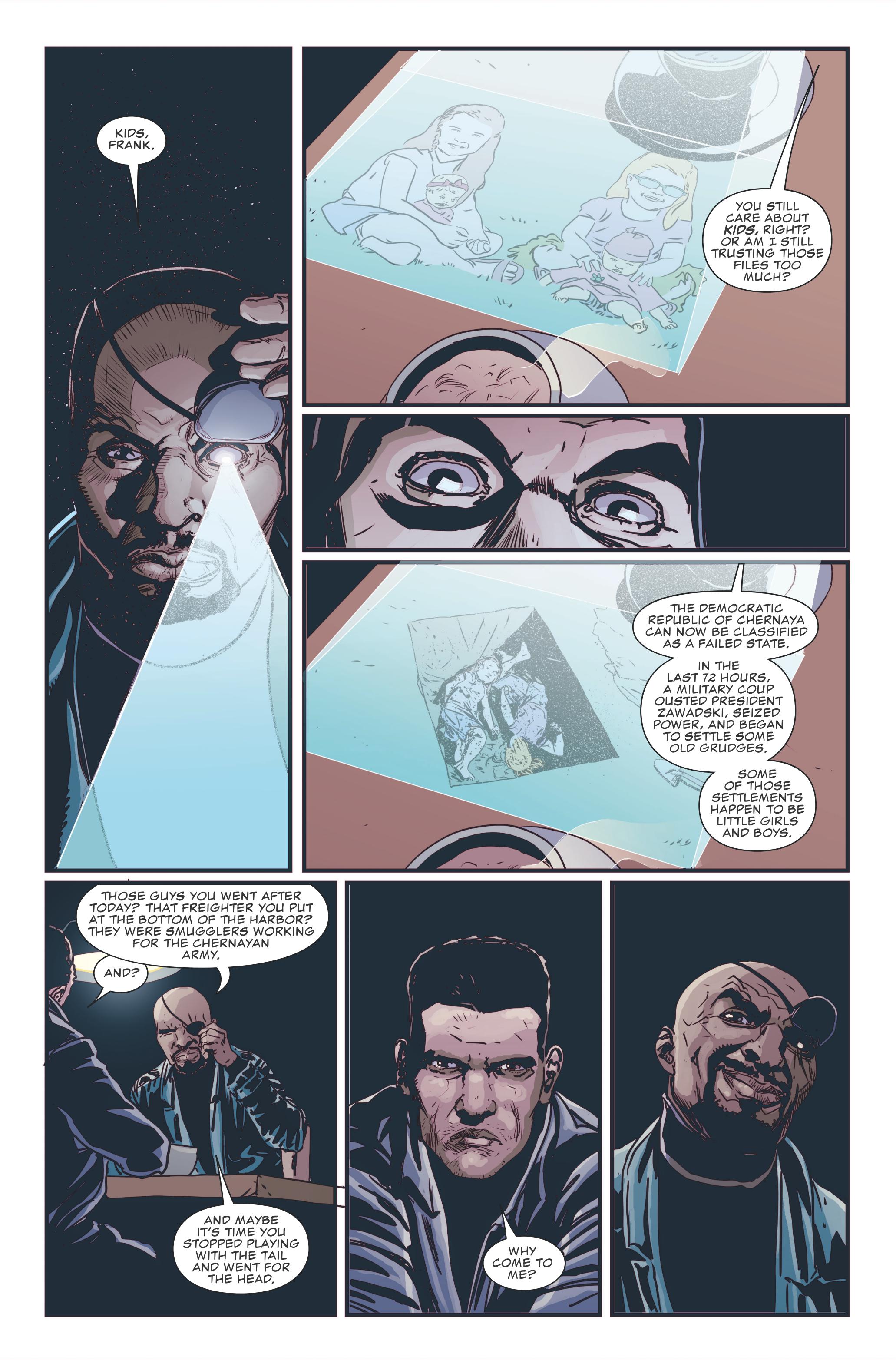 Como pode ser visto nas imagens abaixo, Nick Fury Jr., trabalhando para SHIELD, chamou Frank Castle para lhe ofertar um trabalho. O pequeno país fictício da República Democrática de Chernaya sofreu um golpe militar após falir e os militares estão retomando métodos nada agradáveis e crianças tem sido vitimas nesse processo. Confira o preview: